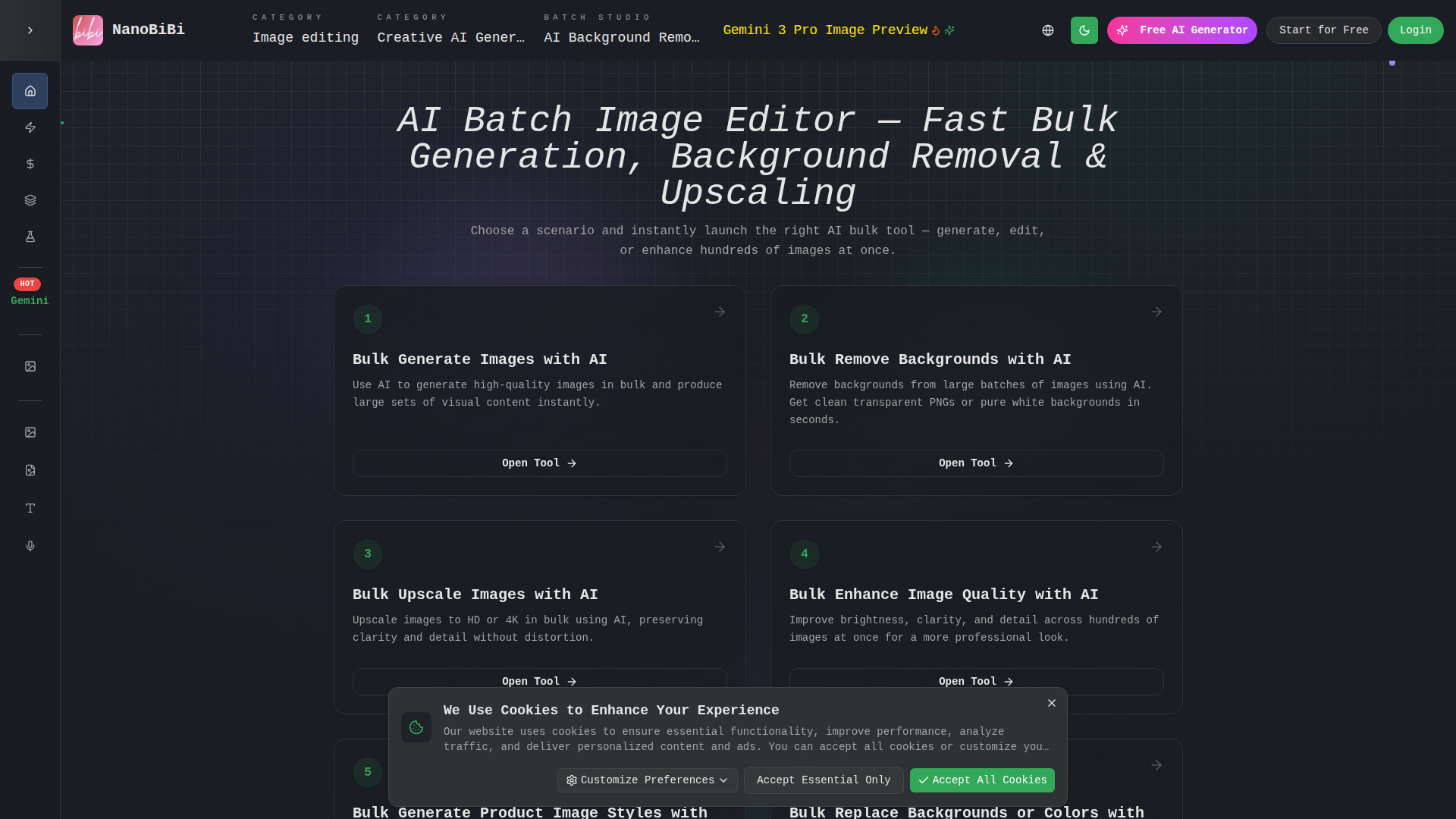 NanoBiBi is an AI-powered batch image editor designed to streamline image processing workflows, particularly for e-commerce businesses. It offers tools for bulk background removal, image upscaling, style transfer, and more. NanoBiBi is Ideal for e-commerce operations, agencies, and marketplace teams, NanoBiBi enables users to efficiently generate, edit, and enhance large volumes of images. Its features are tailored to automate tasks such as creating product images for online stores, enhancing low-resolution photos, and ensuring brand consistency across all visual assets. The platform also caters to individual creators by providing AI image generation and enhancement tools.