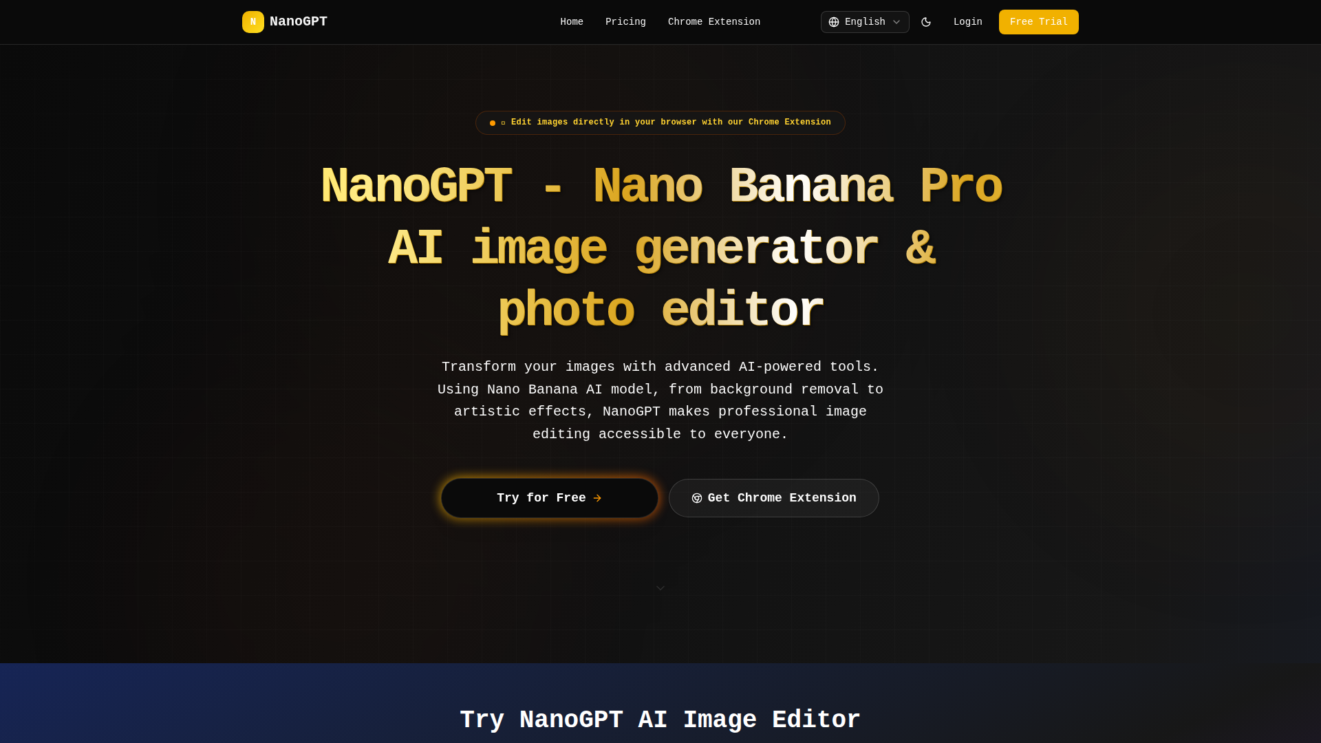 NanoGPT is a professional AI image editing tool powered by the Nano Banana AI model. It offers a suite of advanced features like background removal, image enhancement, and style transfer, making professional-quality image editing accessible to everyone. With a user-friendly interface and a Chrome extension for seamless integration, NanoGPT simplifies image transformation for designers, photographers, e-commerce owners, and digital content creators, processing images securely and quickly. It allows for both simple and complex edits with intuitive tools. NanoGPT is not affliated with Nano Banana.