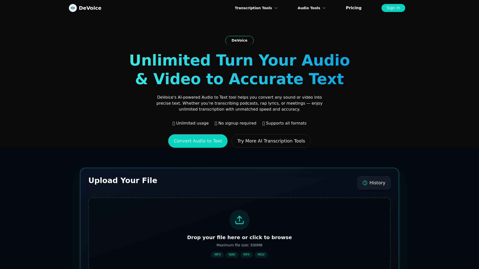 DeVoice is an AI-powered transcription platform that converts audio and video files into accurate text with unlimited usage. It offers a suite of tools including background noise removal, rap lyric generation, and AI noise filtering. Designed for seamless user experience, it supports multiple file formats, ensures high accuracy, and prioritizes data privacy. Ideal for content creators, professionals, and students, DeVoice provides fast processing, customizable results, and affordable pricing plans.