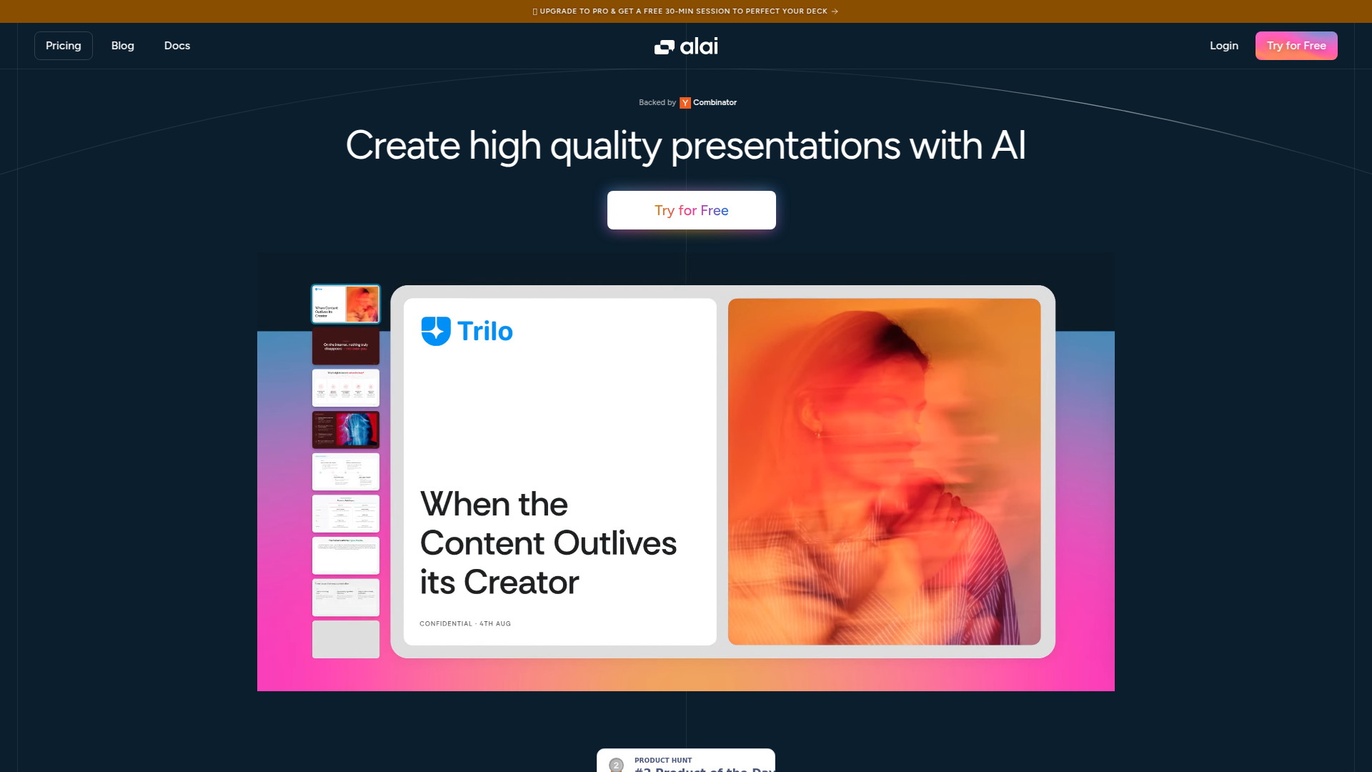 Alai is an AI-powered presentation tool designed to help users create high-quality, professional slides effortlessly. With advanced AI capabilities, it transforms ideas into complete decks in seconds, ensuring consistency, flow, and polished design without requiring manual tweaking. Ideal for professionals, entrepreneurs, and teams, Alai focuses on delivering credibility through visually appealing and logically structured presentations, making it a standout solution in the crowded presentation software market.