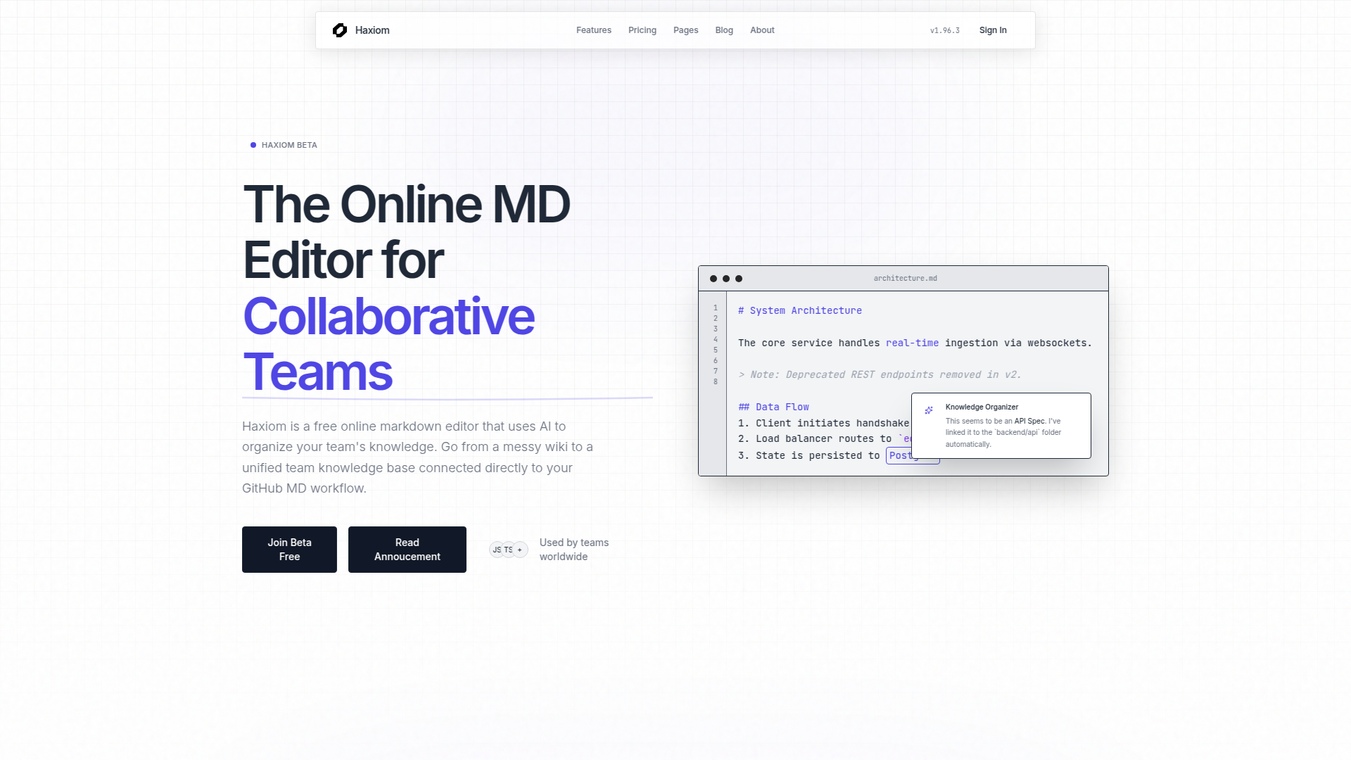 Haxiom is a revolutionary online markdown editor designed for collaborative teams, integrating AI-powered semantic understanding to transform chaotic wikis into structured knowledge bases. With features like real-time multiplayer editing, GitHub syncing, semantic search, and intelligent duplication detection, it empowers teams to maintain up-to-date documentation seamlessly. Its markdown-native approach ensures no vendor lock-in while providing beautiful math rendering and free publishing capabilities. Perfect for developers, technical writers, and knowledge-driven organizations.