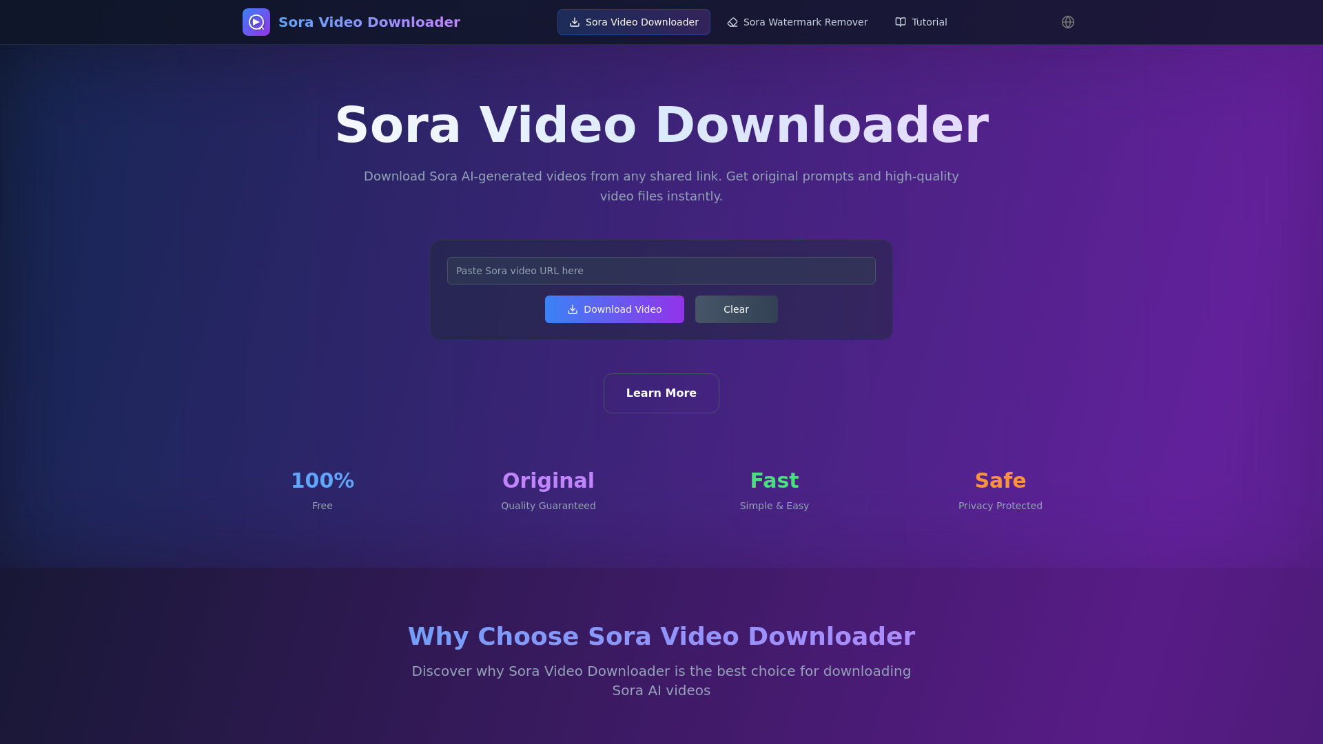 Sora Video Downloader is a specialized online tool designed to download AI-generated videos from the Sora platform. It allows users to extract high-quality videos from any shared Sora link while preserving original quality and providing access to the original prompts used for video generation. The tool caters to content creators, researchers, and AI enthusiasts who want to analyze, study, or gain inspiration from Sora's AI video technology. With its simple interface and fast processing, it bypasses Sora's official download restrictions while maintaining user privacy and security.