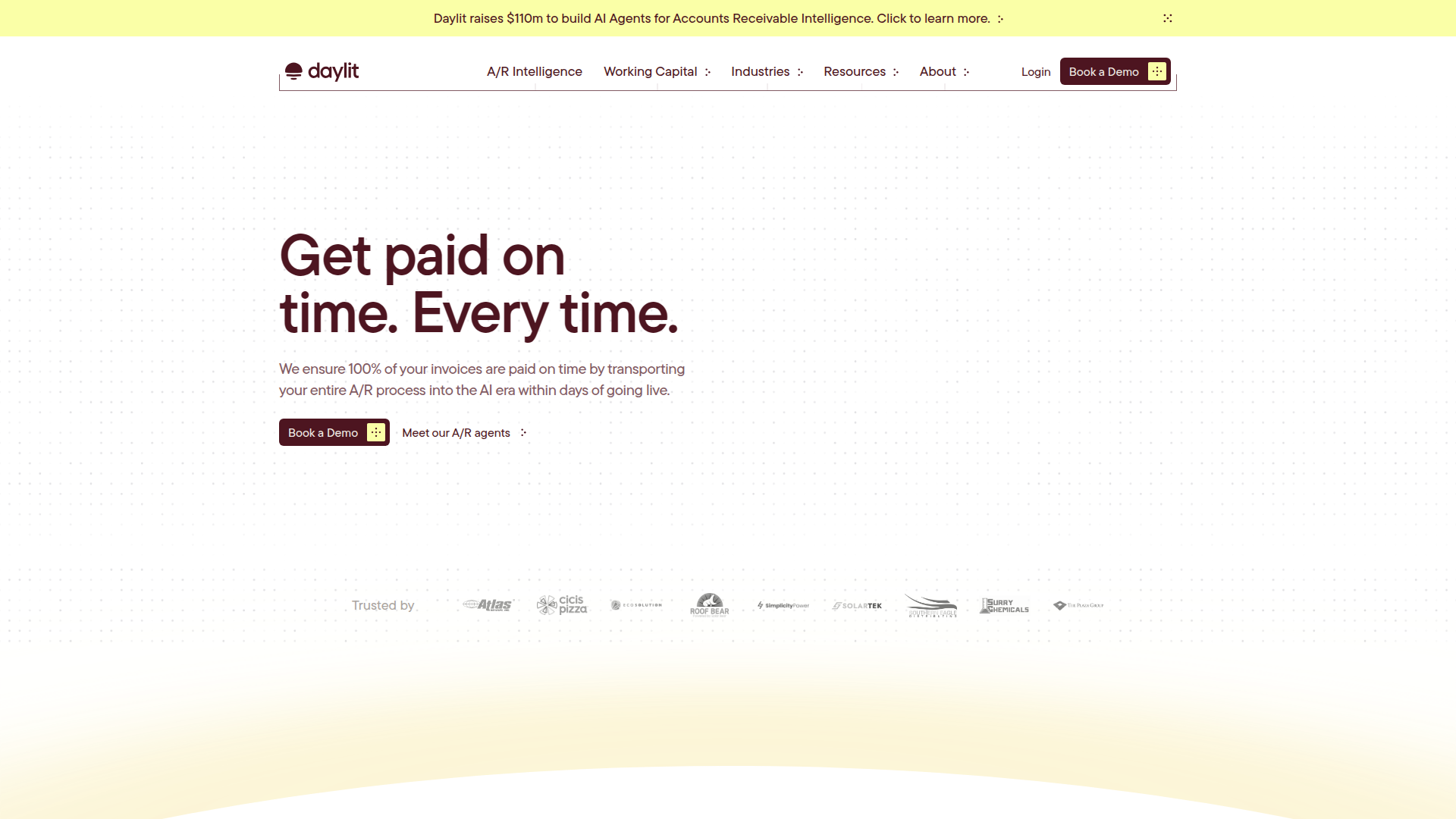 Daylit is an all-in-one working capital platform leveraging AI agents to transform accounts receivable management and provide flexible financing solutions. Designed for businesses seeking to optimize cash flow, Daylit offers instant invoice financing, payment term customization, and AI-driven receivables intelligence. The platform serves industries like retail, manufacturing, and specialty contracting with 24/7 automated collections, cash flow forecasting, and early payment discount capture. Its intuitive dashboard provides real-time insights while its embedded financing solutions help businesses access capital without equity dilution or long-term debt commitments.