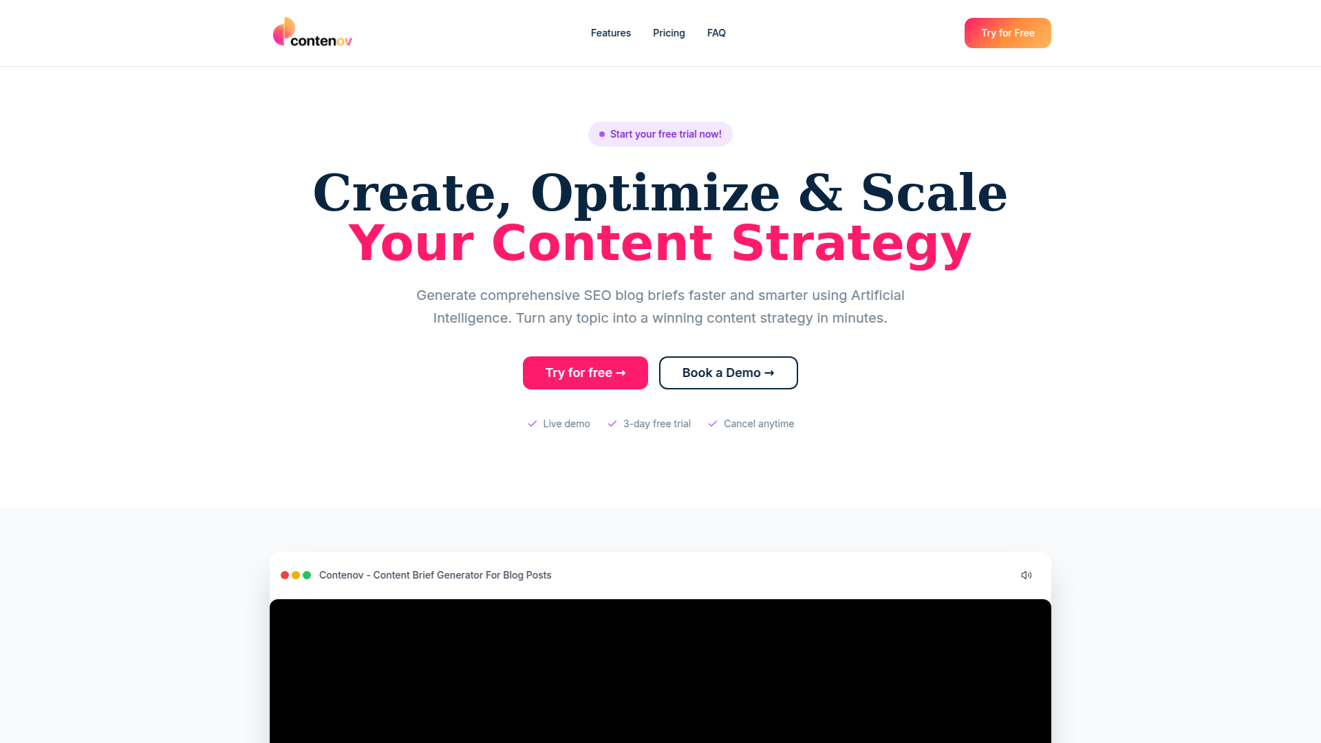 Contenov is an AI-powered content brief generator designed to streamline and optimize the blog creation process for content creators, marketers, and agencies. The platform uses advanced AI to analyze competitor content, extract winning strategies, and generate comprehensive SEO-optimized blog briefs in minutes. With features like smart competitor analysis, SEO intelligence, and performance insights, Contenov helps users save time and resources while producing high-quality, data-driven content that ranks well on search engines. Its intuitive interface, customizable templates, and team collaboration tools make it ideal for both solo creators and large agencies looking to scale their content production efficiently.