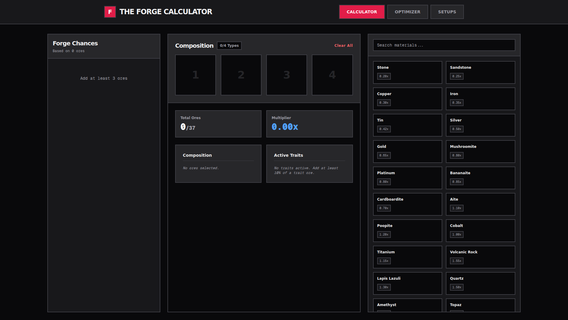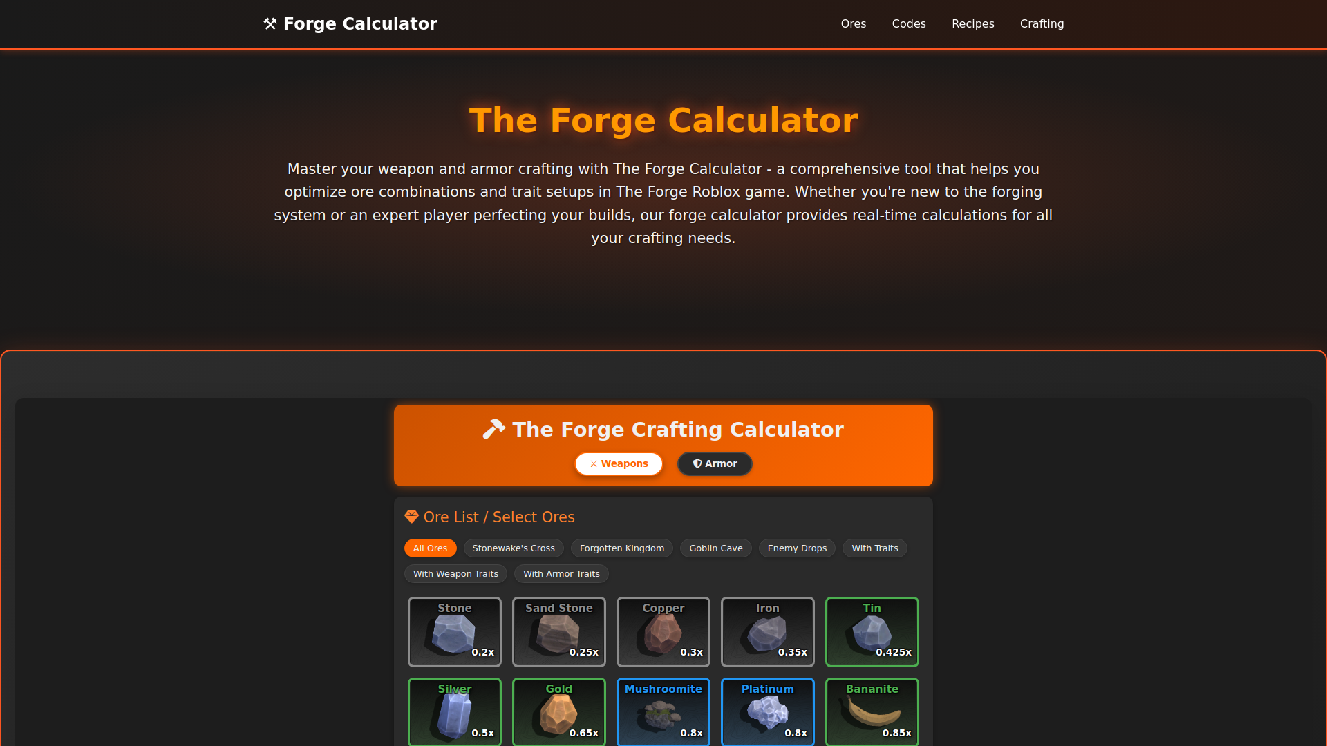 The Forge Calculator is an essential fan-made tool for players of The Forge on Roblox, designed to optimize weapon and armor crafting. It provides real-time calculations for ore combinations, trait setups, modifier multipliers, and optimal ore amounts. With intuitive interface and complete coverage of all game mechanics, it helps both beginners and expert players plan their builds effectively, eliminating manual calculations and guesswork in the forging process.