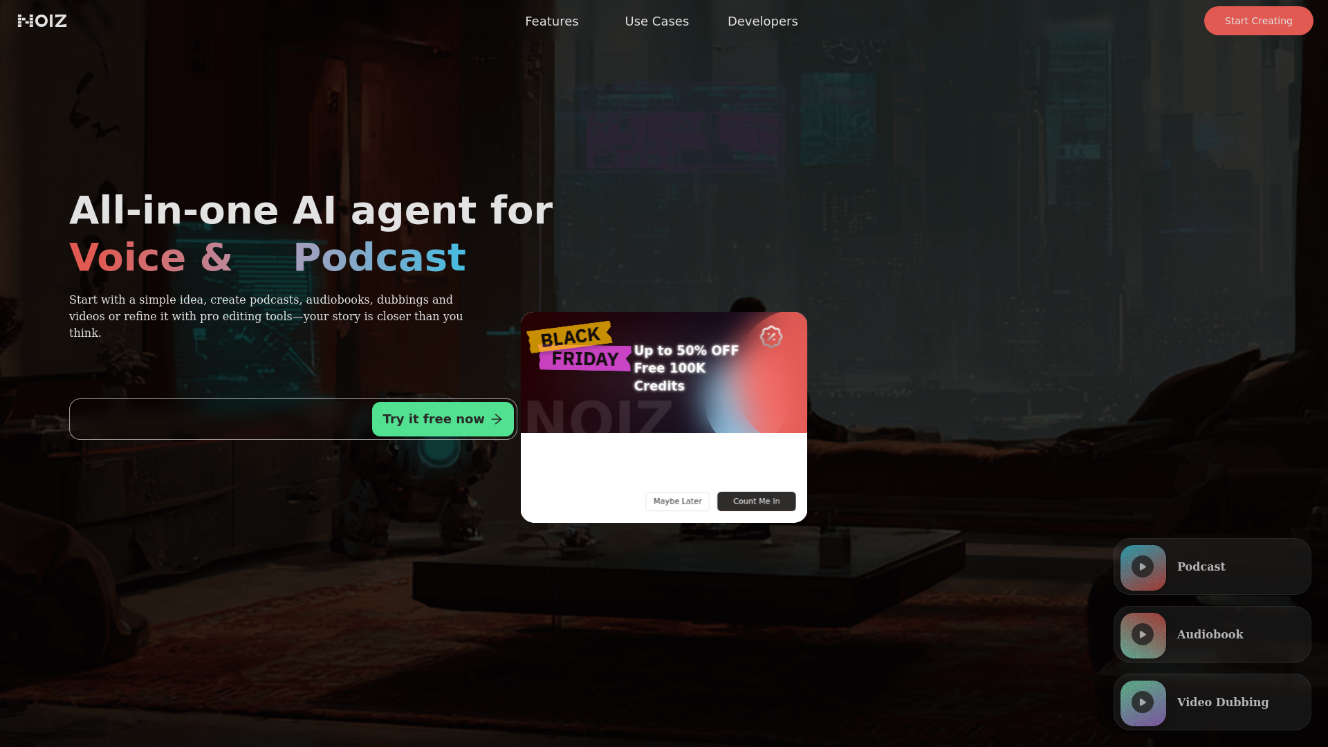 Noiz Agent is an all-in-one AI-powered platform specializing in voice cloning, emotion-rich audio generation, and multimedia content production. It offers innovative solutions for podcast creation, audiobook narration, video dubbing, and expressive voice synthesis. The platform combines proprietary AI voice models with intuitive editing tools, enabling users to transform text into emotionally resonant audio content across multiple languages. With features like text-to-emotion voice conversion, automated podcast generation, and cinematic audiobook narration, Noiz Agent empowers content creators, marketers, and developers to produce professional-grade audio content efficiently.