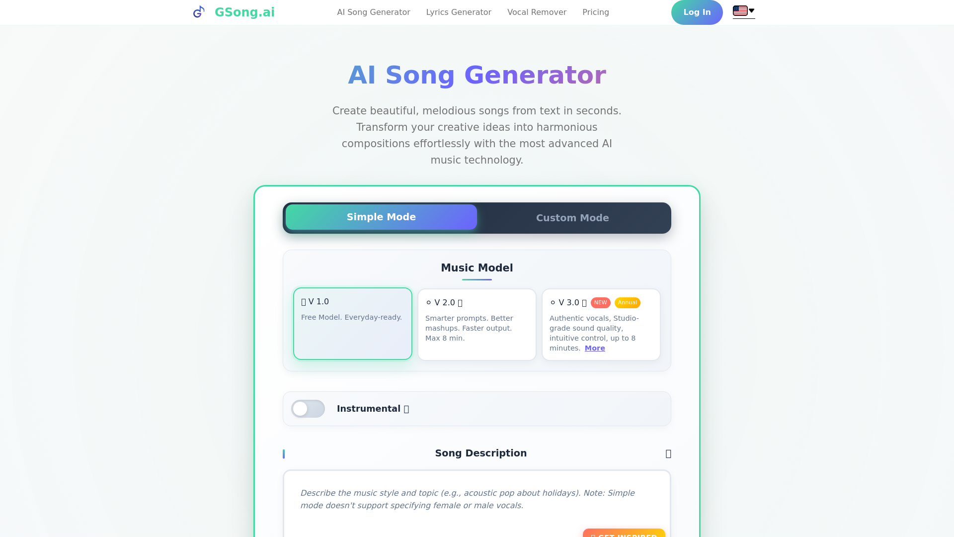 GSong.ai is an advanced AI-powered music creation platform that transforms text into professional-quality songs. Designed for musicians, content creators, and music enthusiasts, it offers an intuitive browser-based studio with features like AI song generation, lyrics creation, vocal removal, and commercial licensing. Users can generate songs in multiple genres and moods with male/female vocal options, download high-quality MP3/WAV files, and access premium features like extended song duration and studio-grade sound quality through subscription plans.